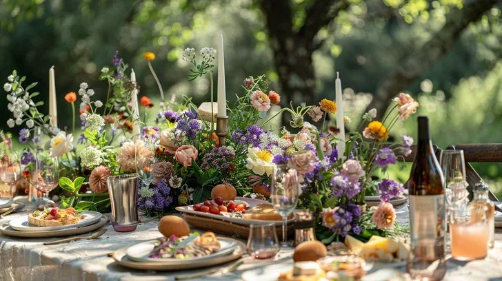 Our themed dinner parties are fully catered, offering a unique outdoor dining experience surrounded by flowers and countryside views.