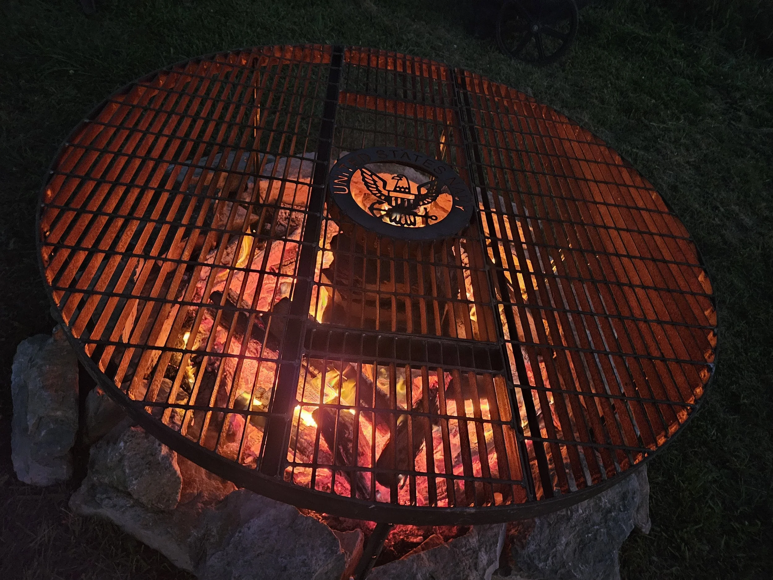 A custom-made round steel fire pit (6 feet wide)—a cozy, stylish centerpiece for fireside toasts and evening gatherings
